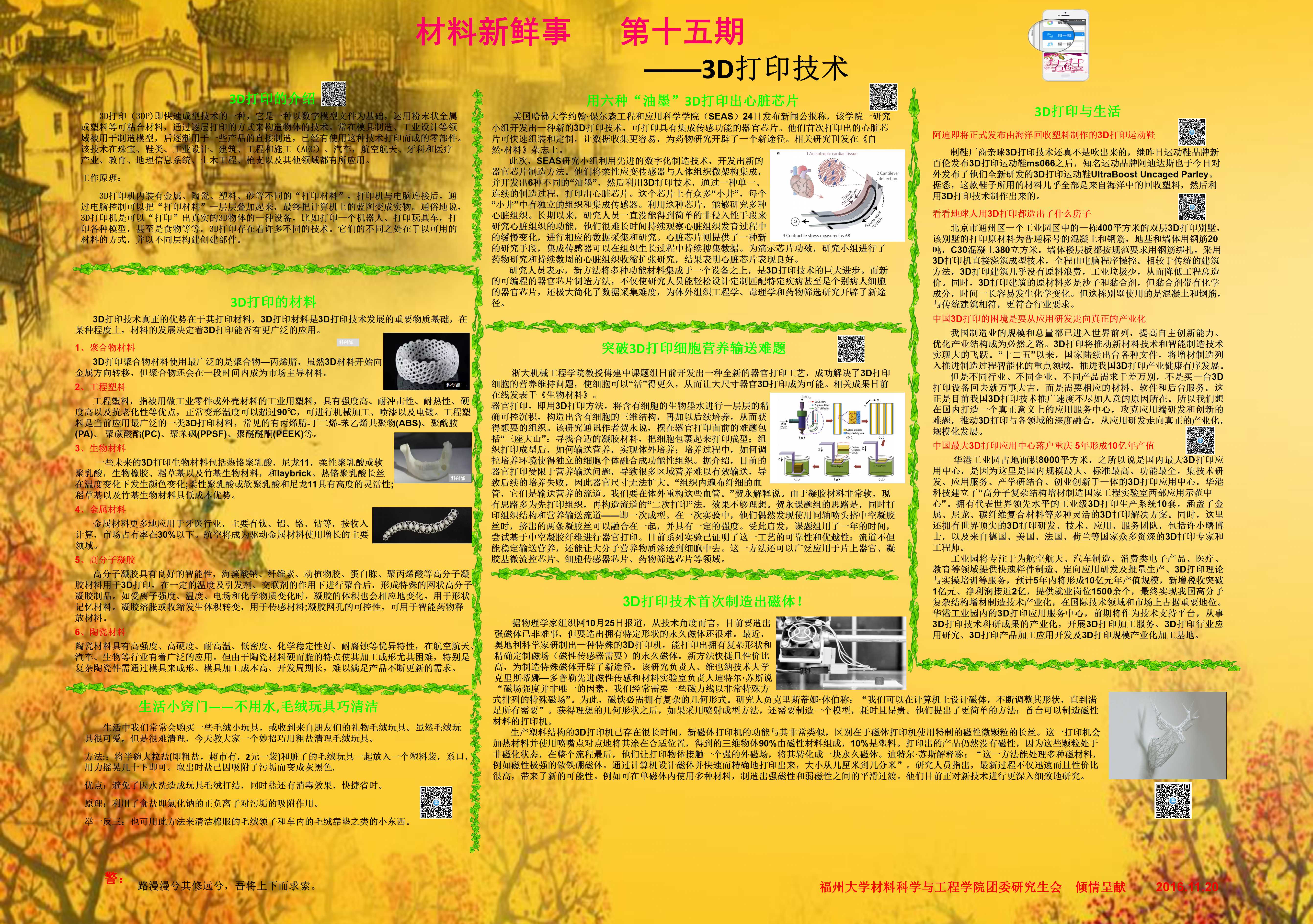 3D打印是一种以数字模型文件为基础,运用粉末状金属或塑料等可粘合材料,通过逐层打印的方式来构造物体的技术。它通常是采用数字技术材料打印机来实现的,被用于模具制造、工业设计等领域制造模型,并在珠宝、牙科、医疗产业、航空航天、土木工程、枪支等领域都有所应用。3D打印机与普通打印机所有区别,3D打印机打印的是金属、陶瓷、塑料、砂等材料。“3D打印机与电脑连接后,电脑控制将‘打印材料’一层层叠加起来,实现计算机上的蓝图变成实物。”一名研究生介绍到。科普海报有助于同学们拓宽视野,增长知识,了解更多材料领域的新闻时事。希望同学们能够紧跟时代步伐,积极进取,为科学发展做出应有的贡献。