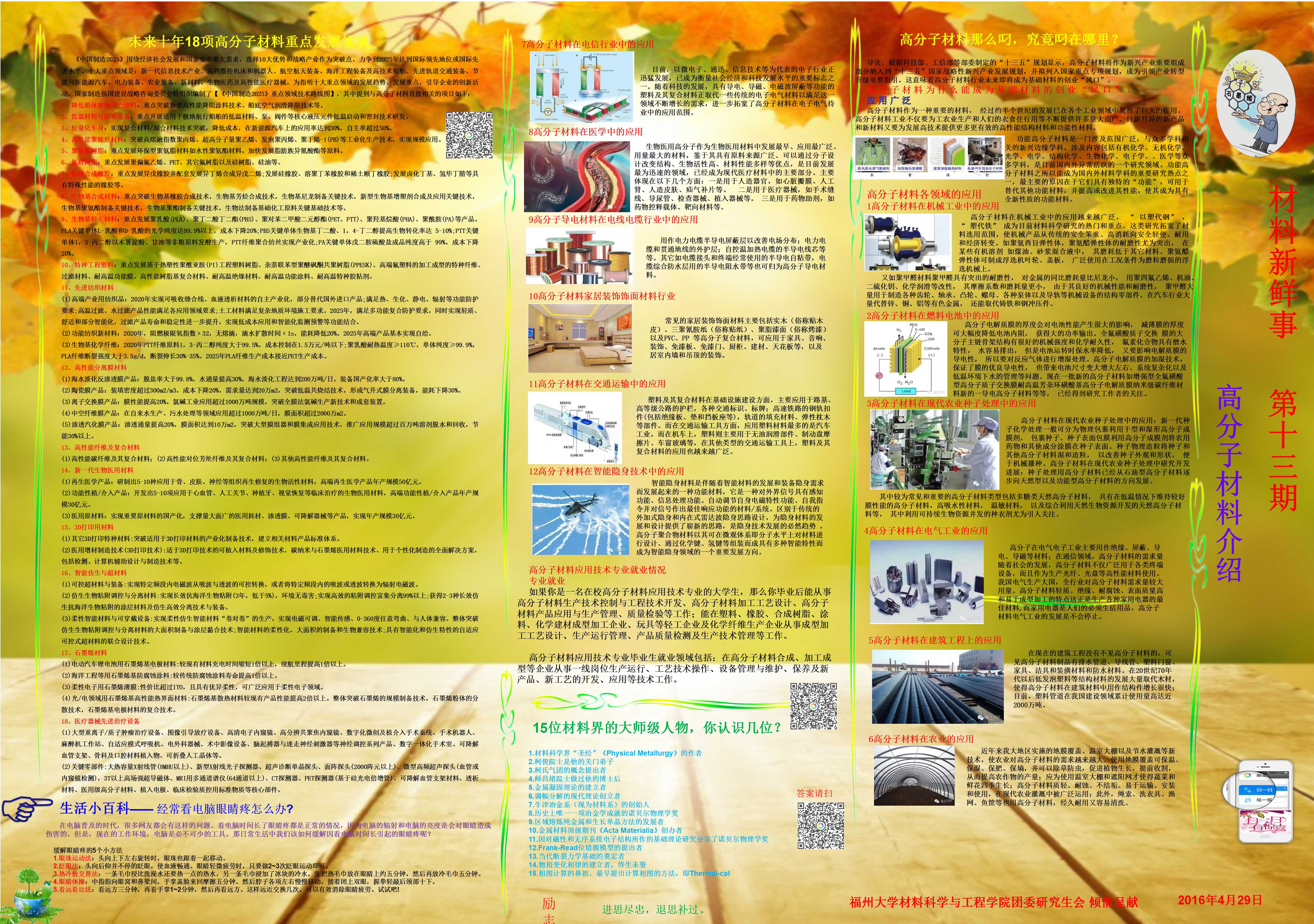 4月29日,材料新鲜事第十三期如期开展,材料新鲜事由成人动漫 研究生会创办,以海报的形式向大家展示材料领域科技的一些最前沿的一些报道;每一期的材料新鲜事都会给大家带来科研“时事”——在各个材料领域,取得的最新进展。本期以高分子材料为主题,介绍了高分子材料的应用领域和未来十年高分子材料的重点发展领域。