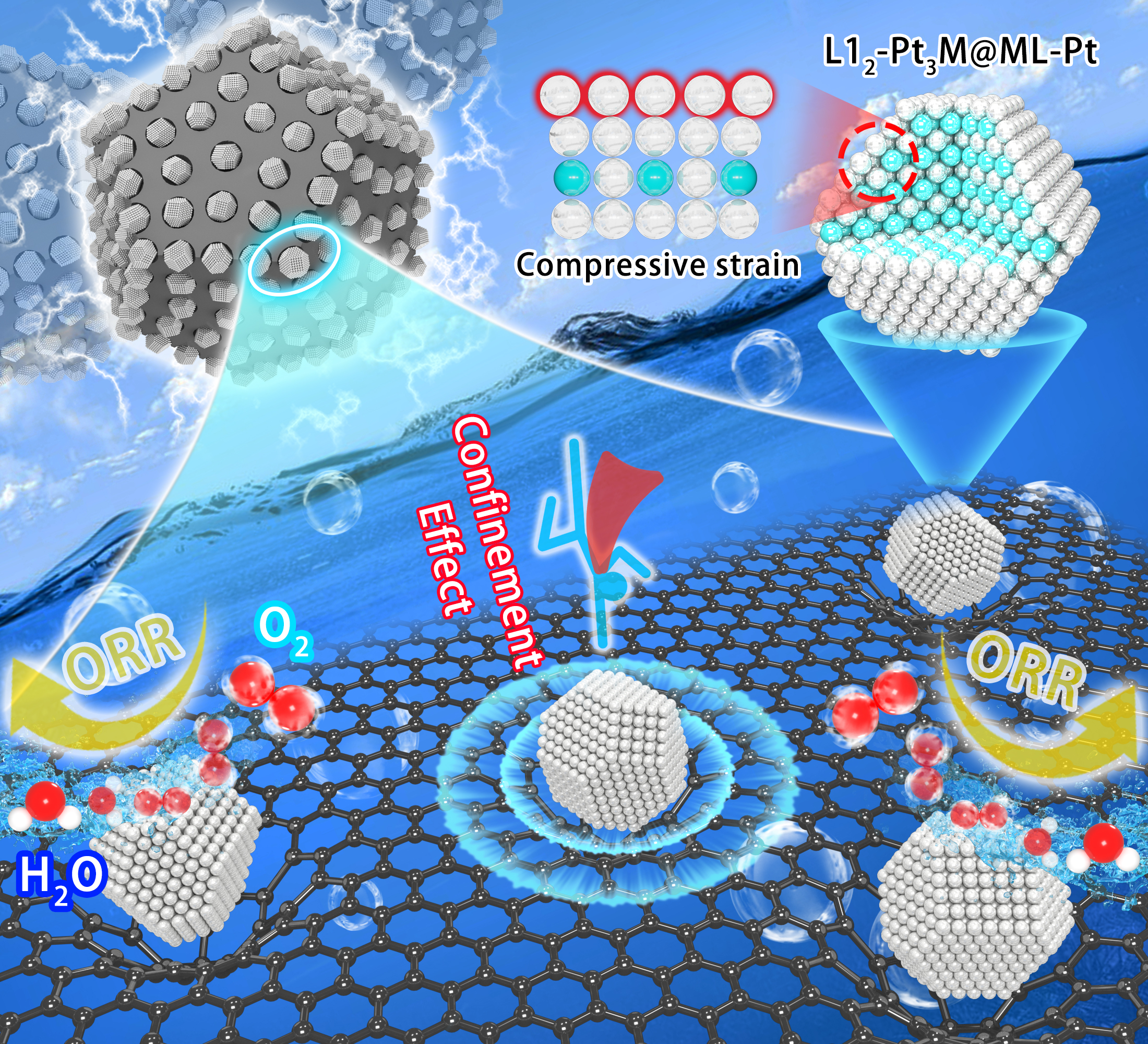 该论文报道了利用精确调控的多孔碳的限域作用制备具有超薄Pt层(Pt-skin)的超小尺寸Pt基金属间化合物,作为高效、稳定的燃料电池氧还原反应电催化剂。该项研究基于超小尺寸Pt基金属间化合物的晶格应变调节,为设计更有效、更持久的燃料电池催化剂提供了途径。