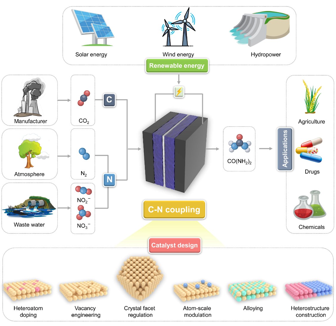 如今,人类社会发展面临能源危机和环境污染的双重考验,面向节能减排和环境综合治理的重大需求,亟需发展协同降碳和人工固氮的新工艺。电催化CO2与含N反应物(N2、NO2−、NO3−)耦合有望在温和条件下实现脱碳和固氮,同时合成高附加值尿素产物,实现“变废为宝”。然而,目前电催化C-N耦合面临反应物活化困难、热力学能垒高、动力学缓慢、副产物多、反应选择性低等关键挑战。因此,高效催化材料的设计与构筑是电催化C-N耦合制尿素领域的研究重点。