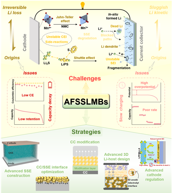 无负极固态锂金属电池(AFSSLMBs)因其理论能量密度高、安全性好、成本低且制造工艺简化等显著优势,被视为下一代高性能电化学储能器件的重要发展方向。然而,该体系在循环过程中普遍存在的锂沉积/剥离效率低、容量衰减快等关键问题,严重阻碍了其实际应用进程。为突破这一瓶颈,亟需从新的视角深入理解其失效机制并探索优化策略。