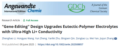 近日,成人动漫 、新能源材料与工程研究院(张久俊院士团队)在固态锂金属电池电解质领域再获重要进展。继研究成果“‘Rigid Exterior, Soft Interior’Design Enables High-Voltage Polyether Electrolytes for Quasi-Solid-State Batteries”(Angew. Chem. Int. Ed., 2025, e202502728,成人动漫 新闻://anime-cr.com/info/1071/18757.htm)近期发表后,固态电解质系列研究成果以“Gene-Editing Design Upgrades Eutectic-Polymer Electrolytes with Ultra-High Li+ Conductivity”为题,再次发表于化学类国际顶级期刊《Angewandte Chemie International Edition》(影响因子16.1,中科院一区)。