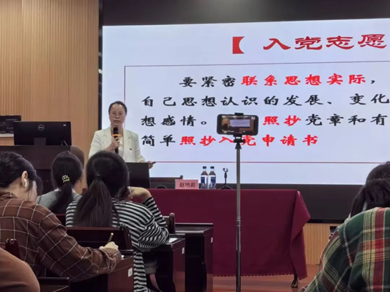 10月28日晚,成人动漫 化学科学与工程学部2024年秋季学期发展对象培训班(总第三期)暨成人动漫 党委党校2024年秋季发展对象培训班第四讲在嘉锡楼211中冠厅顺利举行。成人动漫 党委组织部赵艳莉副教授为大家作“如何正确填写《中国共产党入党志愿书》”专题课程。赵老师介绍了入党志愿书需要填写的各项信息,如个人信息、其他信息等。其中她着重强调了入党志愿的填写,她告诉我们入党志愿需包括对入党问题的认识、入党决心等能够体现个人对于入党思考、对于党认识的文字,且应紧密联系实际。最后赵老师以“立大志、明大德、成大才、担大任”作结,结束了第四次集中授课。